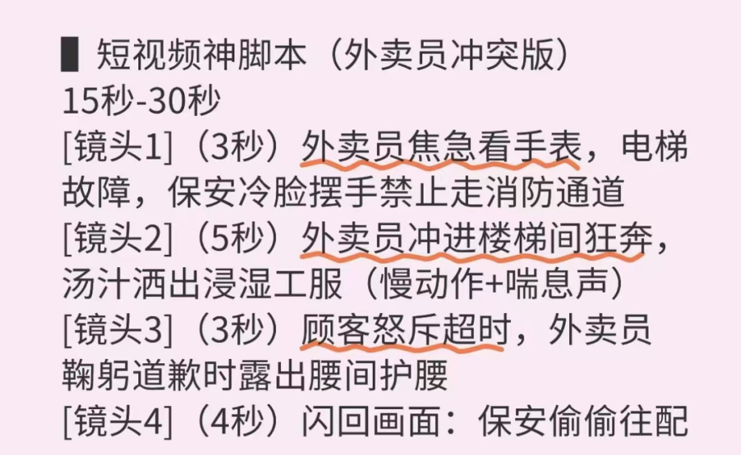 记者发现,灵活就业者因职业门槛低、模仿成本小,且与民众日常生活高度关联,更易成为短视频创作的素材。经检索发现,多个网购平台以低廉的价格销售各种短视频脚本,其中就包括骑手类、网约车司机类等。在一些社交平台上,甚至还有博主直接分享关于骑手摆拍的短视频脚本。账号为“**明”的博主提供了一个极具戏剧冲突的脚本,其中包括“外卖员焦急看手表”“保安冷脸”“顾客怒斥”等元素。