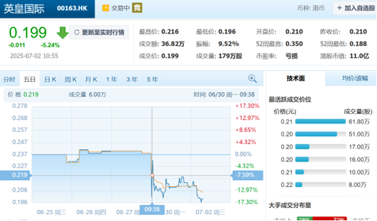 •7月2日淘优配,英皇国际股价一度低至0.199港元。