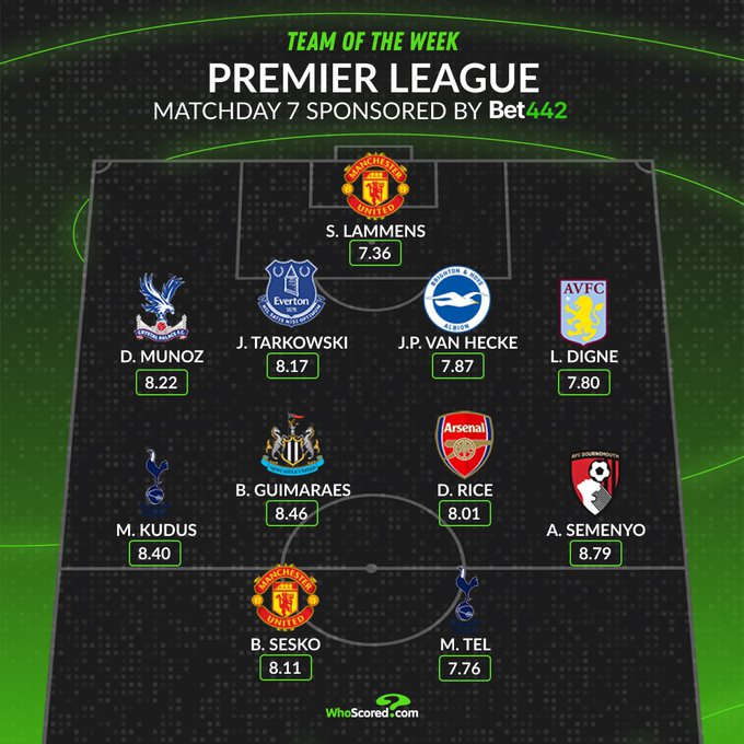 虎扑10月06日讯Whoscored今日发布英超第7轮最佳阵容盘点,赖斯领衔,谢什科、拉门斯入选。