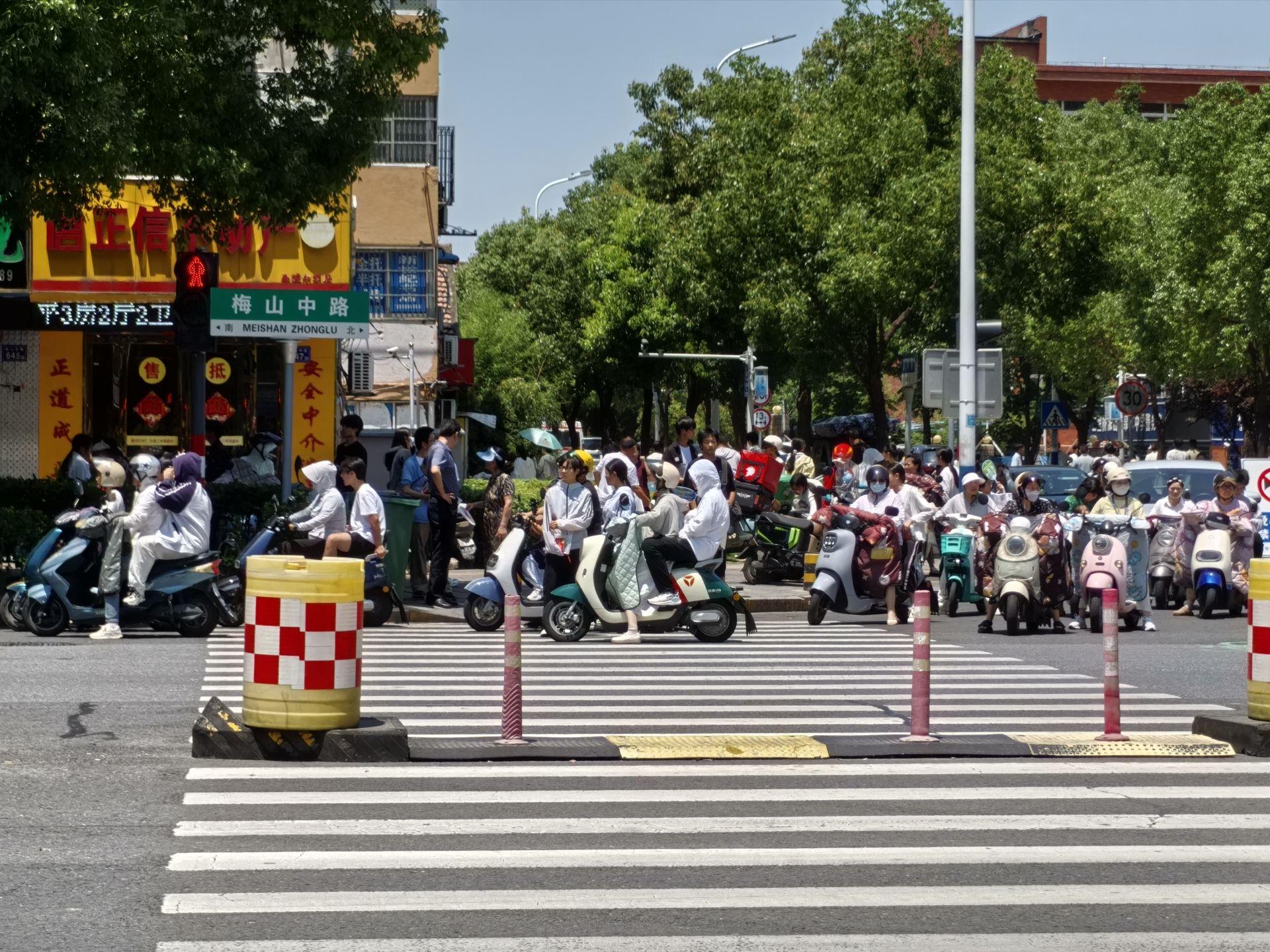 对于中考与高考送考车辆出现的这种变化,在文华路与梅山路口执勤的一位交警分析道:高考期间恰逢大雨天气,骑两轮电动车、摩托车不方便,因此私家车和大巴车相对较多;而中考首日赶上天气晴好且不算太热,骑行既方便又灵活,相比私家车更不容易堵车,故而选择骑车送考的家长显著增加。该交警同时还强调:“无论家长选择何种车辆送考,安全始终是第一位的,务必遵守道路交通秩序。”