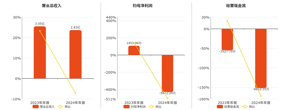公司营业总收入为2.83亿元,在已披露的同业公司中排名第78,较去年同报告期营业总收入减少2192.28万元,同比较去年同期下降7.18%。归母净利润为-5872.24万元谋略天下,在已披露的同业公司中排名第62,较去年同报告期归母净利润减少7324.20万元,同比较去年同期下降504.43%。经营活动现金净流入为-9622.35万元,在已披露的同业公司中排名第77,较去年同报告期经营活动现金净流入减少6094.65万元。