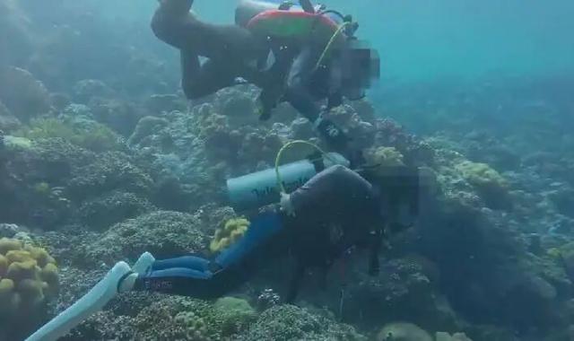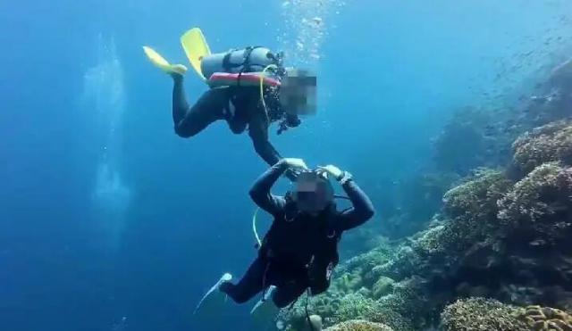 其中,一段时长约 44 秒的视频显示,一名潜水员正面对镜头摆出"比心"动作,身后有另一名潜水员伸手对其气瓶进行操作。随后,被操作气瓶的潜水员疑似察觉异常,迅速更换至备用二级头。
