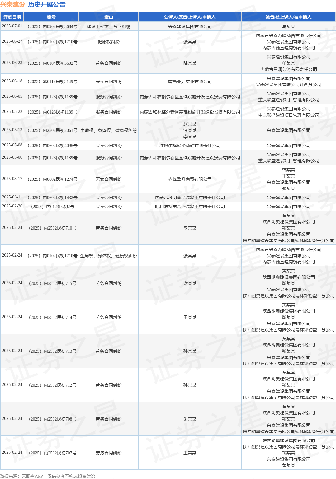 案号:(2025)内0902民初3684号审理法院:乌兰察布市集宁区人民法院案由:建设工程施工合同纠纷当事人信息: 原告/上诉人:兴泰建设集团有限公司 被告/被上诉人:乌某某开庭日期:2025年7月1日根据统计,近一年内以兴泰建设集团有限公司为当事人的历史开庭公告有41则,其中案由为“买卖合同纠纷”的公告以12则居首,其次为“劳务合同纠纷”有11则,“建设工程施工合同纠纷”有4则。历史开庭公告(前20条)如下: