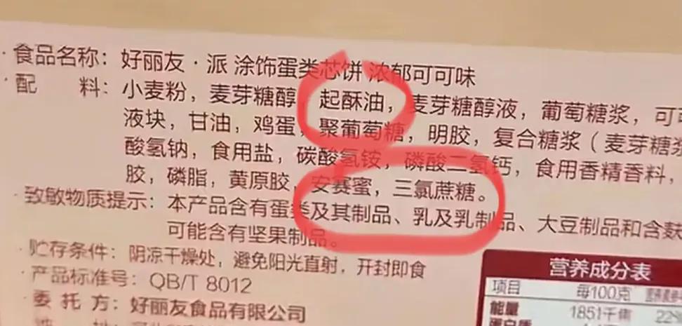 新上架的“低糖好丽友派”,打着“减糖80%、可可含量提升30%”的口号,但配料表的第三位却是“起酥油”,妥妥打脸“菁英生活”。