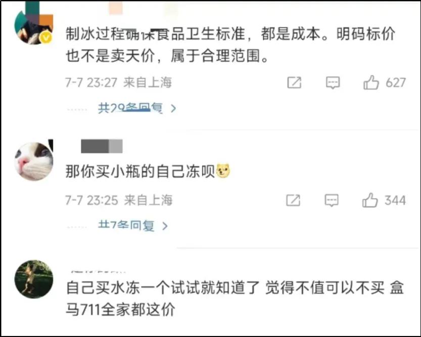 7月7日,“山姆2公斤冰块卖22.8元”的话题冲上热搜,被网友质疑价格高,他们主动帮山姆说话:“嫌贵不买不就完了吗”。
