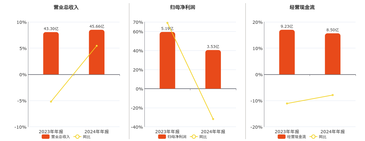 公司营业总收入为45.66亿元。归母净利润为3.53亿元,较去年同报告期归母净利润减少1.65亿元,同比较去年同期下降31.88%。经营活动现金净流入为8.50亿元,较去年同报告期经营活动现金净流入减少7281.58万元,同比较去年同期下降7.89%。