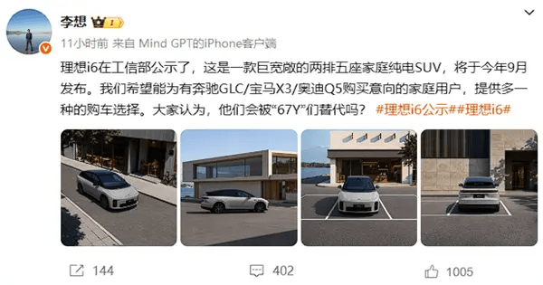 理想汽车CEO李想在i6申报后发文表示,公司希望为有意购买奔驰GLC、宝马X3或奥迪Q5的家庭用户提供另一种购车选择。他提到了“67Y”这一概念,很可能指的是理想i6、小米YU7以及特斯拉Model Y,这三款车型有望在市场上形成强有力的竞争。